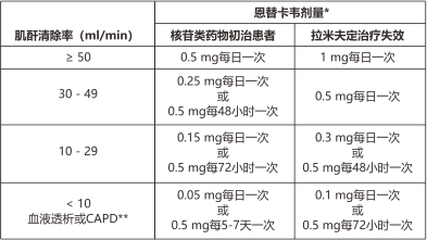 肌酐清除率<50mL/min,包括血液透析或CAPD的患者,建議調(diào)整恩替卡韋的給藥劑量(見(jiàn)【用法用量】)。