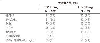 96周期間,ETV組和ADV組治療相關(guān)的2-4級(jí)AEs發(fā)生率相似(分別是13%和16%)。